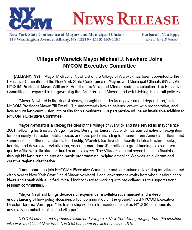 Village of Warwick Mayor Michael J. Newhard has been appointed to the Executive Committee of the New York State Conference of Mayors and Municipal Officials (NYCOM), a leadership role within the statewide organization representing cities and villages across New York State.